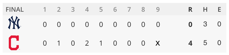ヤンキースはジャッジが4打席4三振と完璧に封じられ、3番のゲーリー・サンチェスと4番のディディ・グレゴリウスも4打数ノーヒット。インディアンス3投手の前にわずか3安打に抑え込まれ、反撃の糸口すら掴むことができず、文字通りの完敗だった。