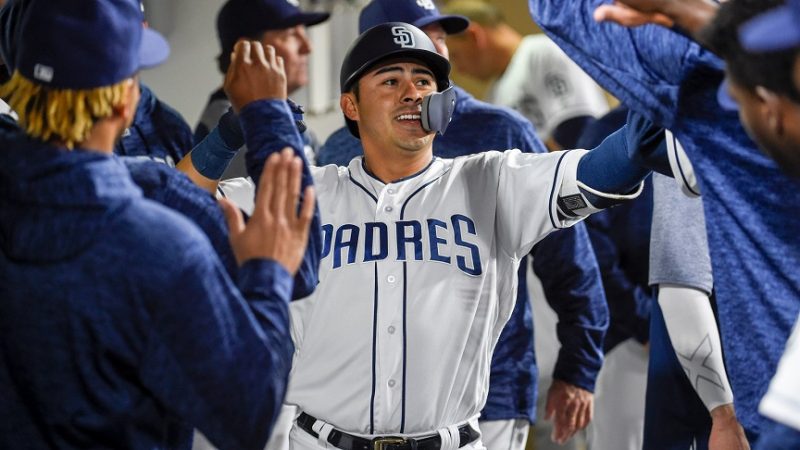 2016年12月にマイナー契約でパドレスに加入し、昨年9月にメジャーデビューを果たして12試合で打率.344、4本塁打、OPS1.094の好成績をマークしたクリスチャン・ビヤヌエバの打撃力はどうやらホンモノのようだ。日本時間4月4日のロッキーズ戦に「5番・三塁」で先発出場したビヤヌエバは、2回裏に先制の1号ソロ、4回裏に追撃の2号ソロ、そして7回裏にダメ押しの3号スリーランを放ち、球団史上7人目、ペトコ・パークでは昨季のハンター・レンフローに次いで史上2人目となる1試合3本塁打を達成。快挙を成し遂げたビヤヌエバは、地元ファンからの大歓声にカーテンコールで応えた。