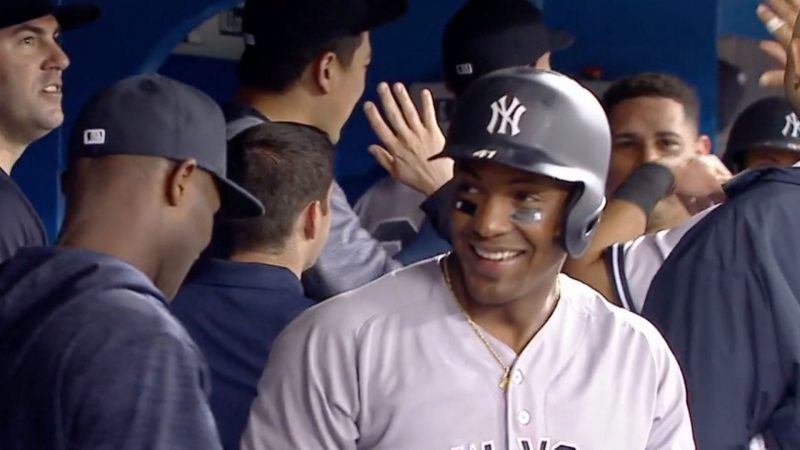 ブルージェイズ先発のマルコ・エストラーダの前に6回まで無得点に抑えられていたヤンキースは、1点ビハインドの7回表、強打の新人三塁手がひと振りで試合をひっくり返した。先頭のゲーリー・サンチェスがヒットで出塁し、ブルージェイズはエストラーダから呉昇桓(オ・スンファン)にスイッチ。ヤンキースはディディ・グレゴリアスが死球、アーロン・ヒックスが四球で出塁して無死満塁とチャンスを広げ、ミゲル・アンドゥハーが初球を豪快にレフトスタンドへ叩き込んだ。アンドゥハーにとってはこれが自身初の満塁弾。ヤンキースは8回表にもヒックスに6号3ランが飛び出し、ブルージェイズ救援陣を見事に攻略して7対2で逆転勝利を収めた。