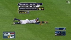 攻守に粗削りながら14本塁打&17盗塁を記録しているようにパワー&スピードが魅力のキーオン・ブロクストン(ブリュワーズ)。今季の守備指標は冴えないものの、またしても俊足を生かした好プレイを披露した。