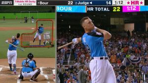 ファースト・ラウンドで23本のアーチを架け、ジャスティン・ボーア(マーリンズ:22本塁打)を撃破したアーロン・ジャッジ(ヤンキース)。23本塁打にカウントされないこの打球のインパクトも大きかった。