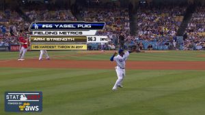 メジャー屈指の強肩の持ち主として知られるヤシエル・プイーグ(ドジャース)が、日本時間6月27日のエンゼルス戦で自慢の強肩を披露した。