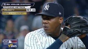 メジャーリーグの最速王はやはりこの男だ。アロルディス・チャップマン(ヤンキース)が復帰2戦目で今季メジャー最速となる102.9マイル(約165.6km/h)を叩き出した。