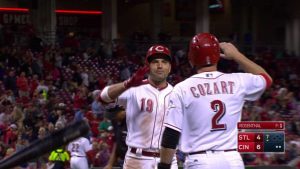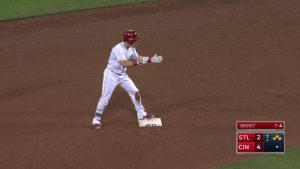 試合の序盤はカージナルス先発のマルティネスを攻略できず、6回までヒットは1本で、二塁すら踏めないまま試合は進む。レッズ先発のウォジチョウスキーも好投するが5回に2点を失い、先制を許してしまう。