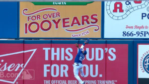グレグ・ガルシアが放ったレフト方向への飛球をフェンスにぶつかりながら捕球